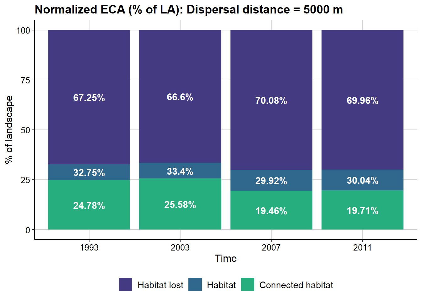 dECA_test$dECA_table| Time | Max. Landscape attribute (ha) | Habitat area (ha) | Distance threshold | ECA (ha) | Normalized ECA (% of LA) | Normalized ECA (% of habitat area) | dA | dECA | rECA | dA/dECA comparisons | Type of change |