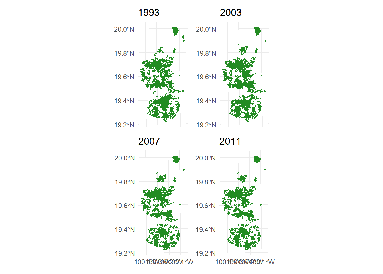 La Reserva de la Biosfera Mariposa Monarca es mundialmente conocida por ser cada otoño una zona de migración, invernada y reproducción para millones de mariposas monarca (Danaus plexippus). Sin embargo, la reserva ha sufrido una gran pérdida de cobertura forestal (López-García y Alcántara-Ayala, 2012). En este ejemplo, analizamos los cambios en la conectividad del bosque templado entre los años 1993, 2002, 2007 y 2011 en la reserva y una zona de influencia de 10 km aplicando la función MK_dECA(). Como distancia de dispersión utilizamos la estimada para Pinus pseudostrobus y P. montezumae de 5 km (Molina et al. 2019). Los parches de bosque se obtuvieron de las coberturas de uso del suelo del Instituto Nacional de Estadística y Geografía (INEGI 2001, 2003, 2007, 2014). Los parches son fragmentos de bosque templado primario (pino y encino). El INEGI define la vegetación primaria como aquella en la que la vegetación no presenta alteraciones significativas o la degradación no es tan manifiesta.