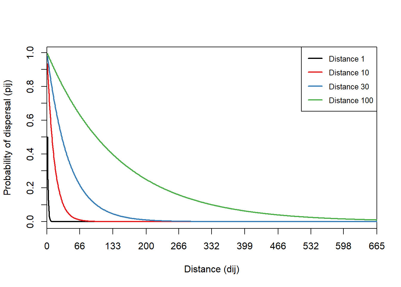 probability_distance(probability= 0.5, median_distance = c(1, 10, 30, 100))