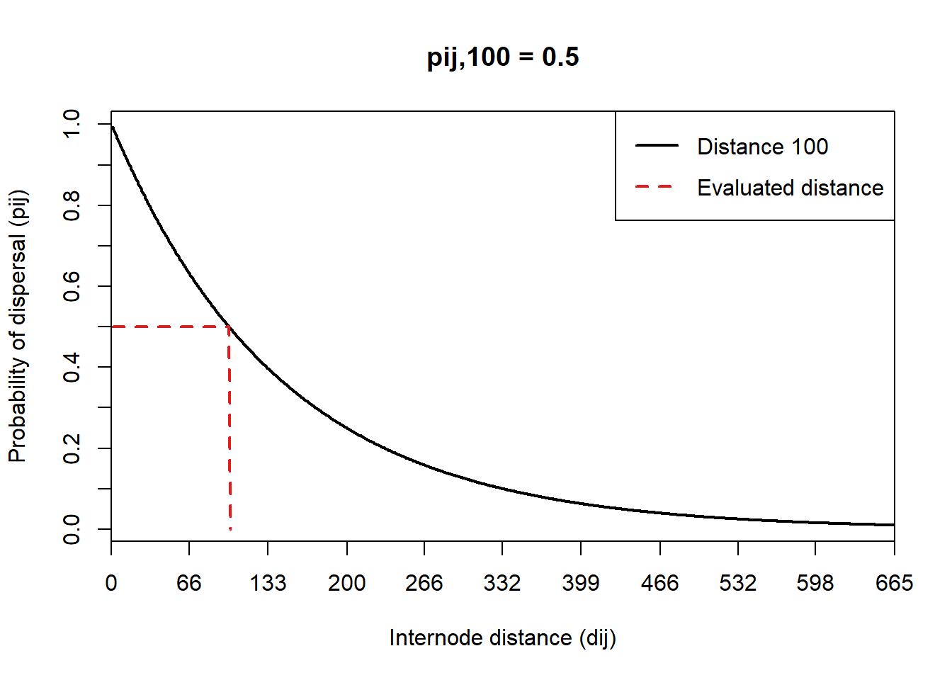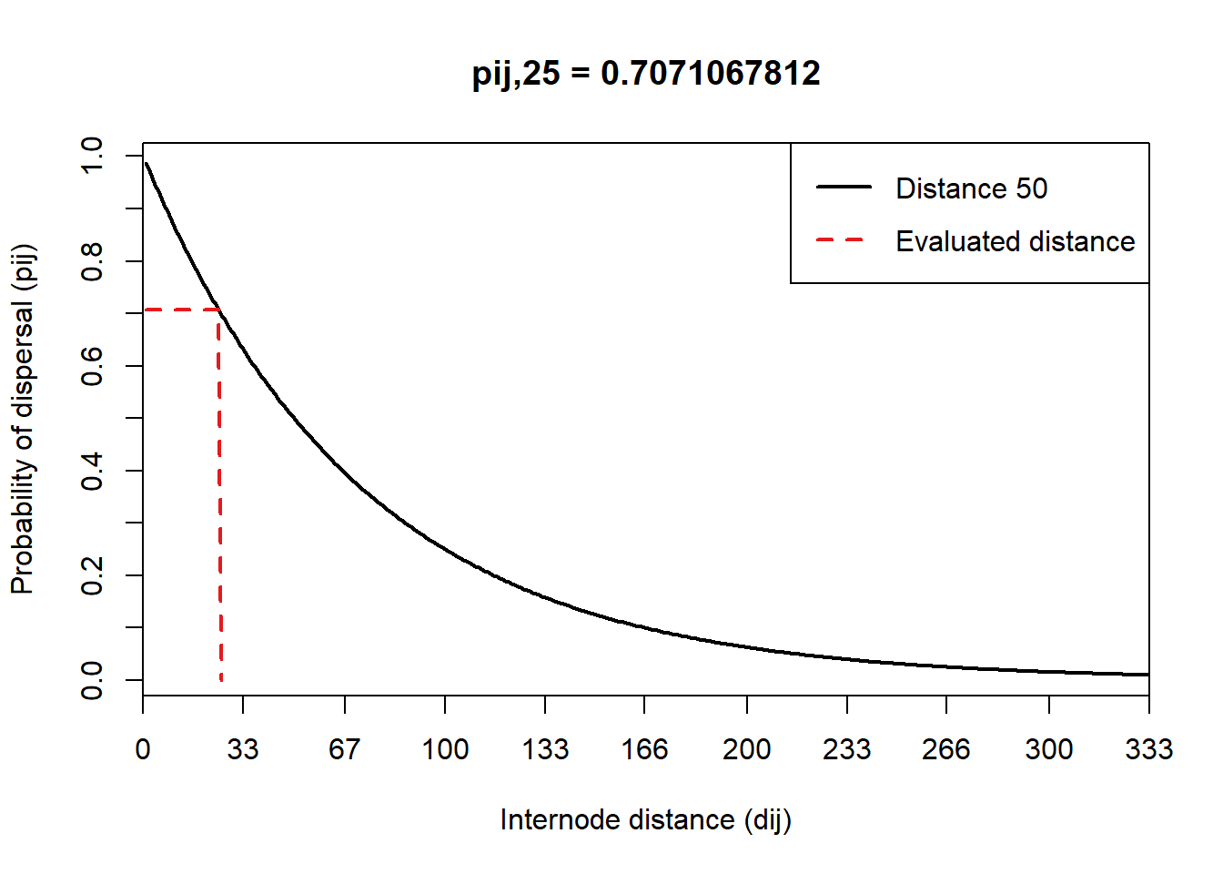 eval_distance. Calcula la probabilidad de dispersión a una distancia mediana específica (km). Disponible cuando sólo se utiliza una distancia_mediana.